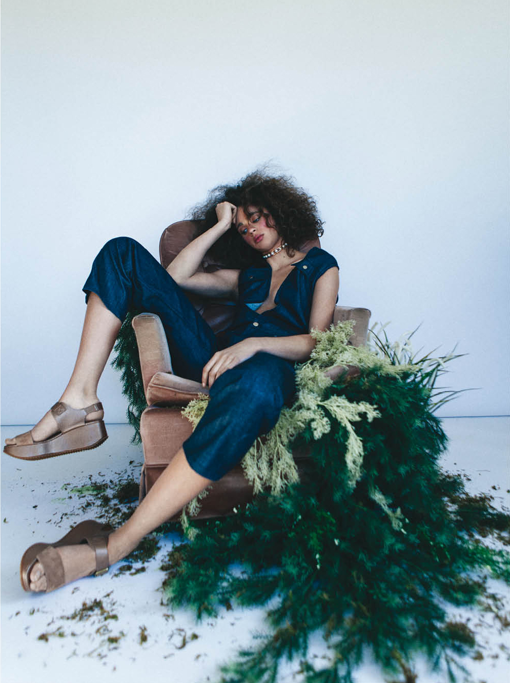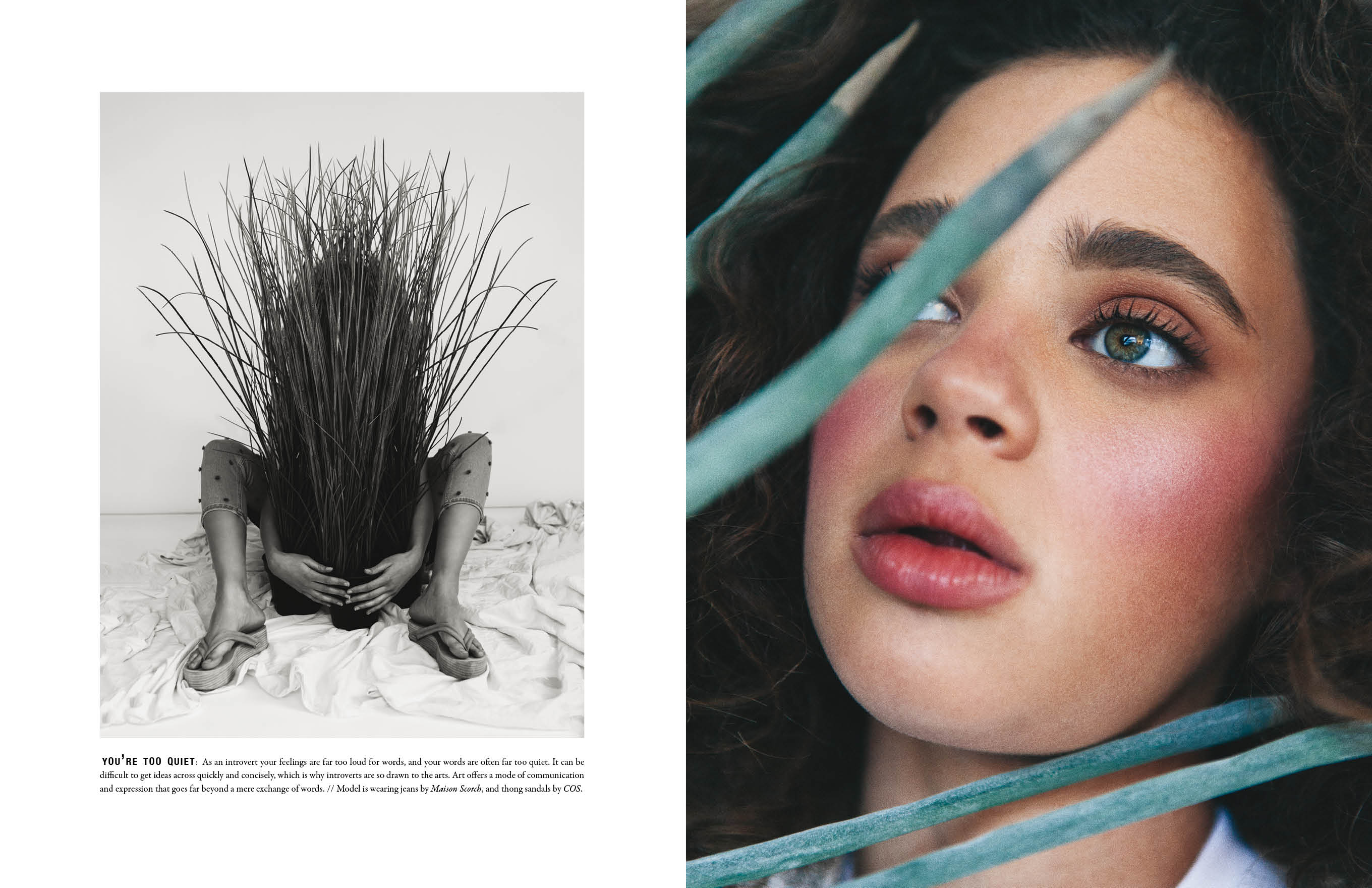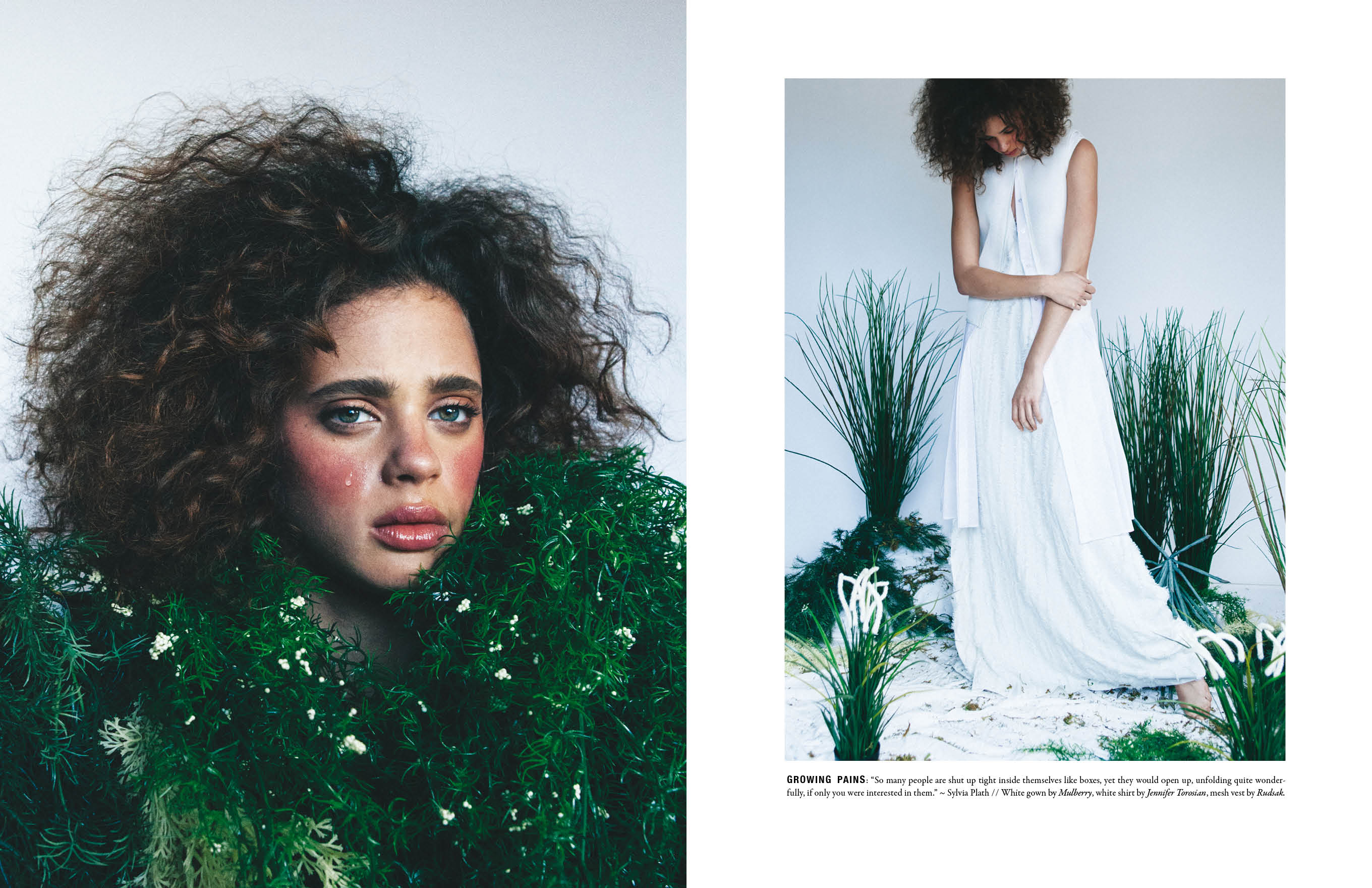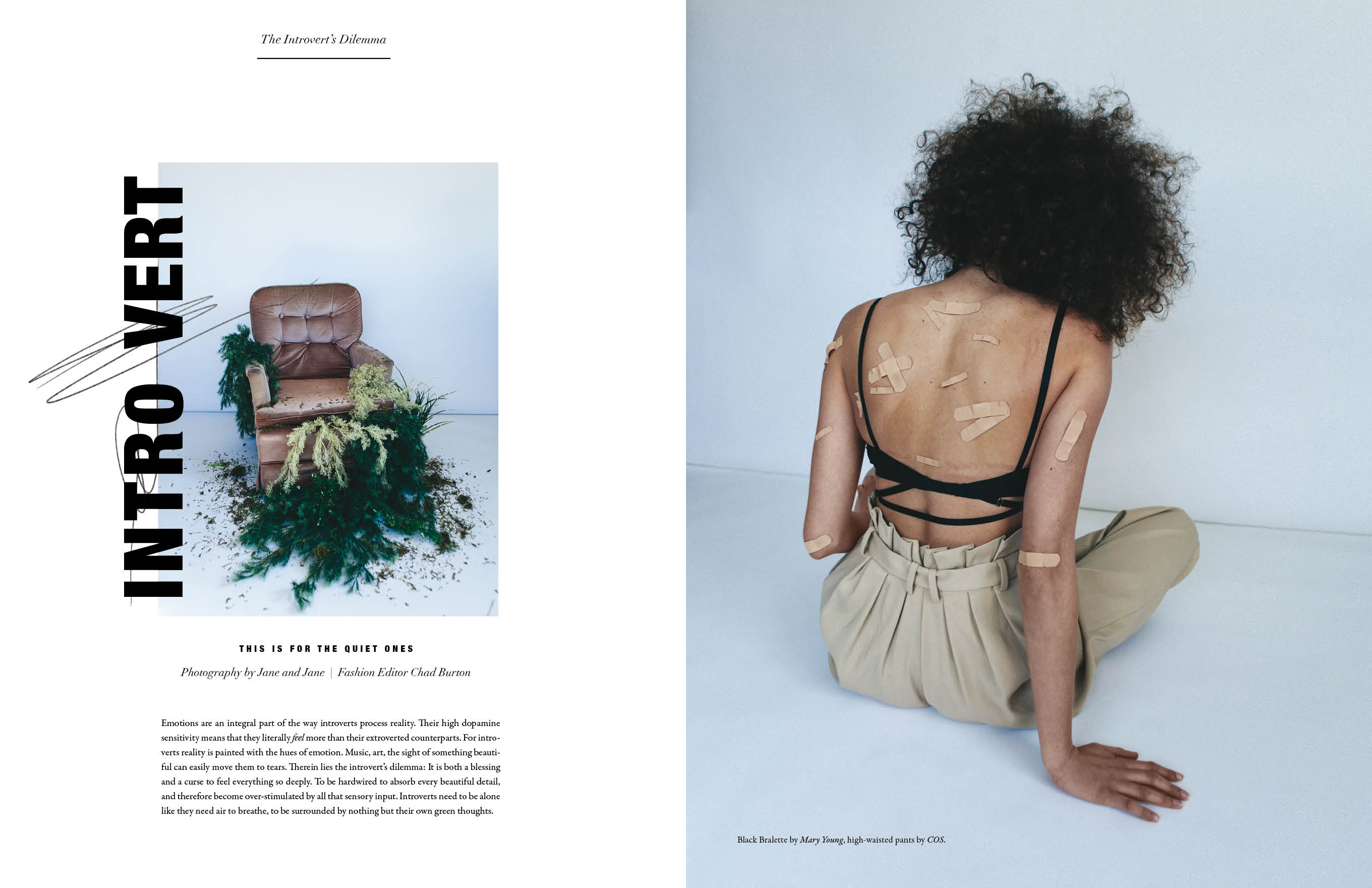 The concept for this editorial came from a play on the word “introvert” (vert, from the French, meaning green). I took the idea a step further by exploring the association between shyness, youthful innocence and springtime. In this way I tied introversion to the color green, and green to the concept of being sensitive and shy like a newly unfurled springtime leaf. The visual metaphor is carried by symbols presented in each image, including bandaids to indicate sensitivity, fresh grass and a bed of flowers out of which our model grows like a springtime plant. All casting, creative direction, art direction, and pagination was executed by me.